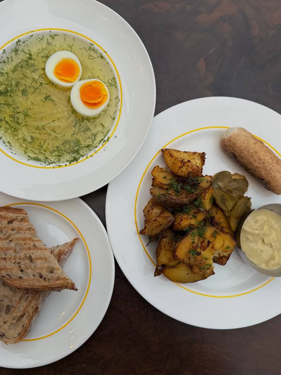 Сосиска з картоплею/ Курячий бульйон або Солянка/ Цитрусовий чай