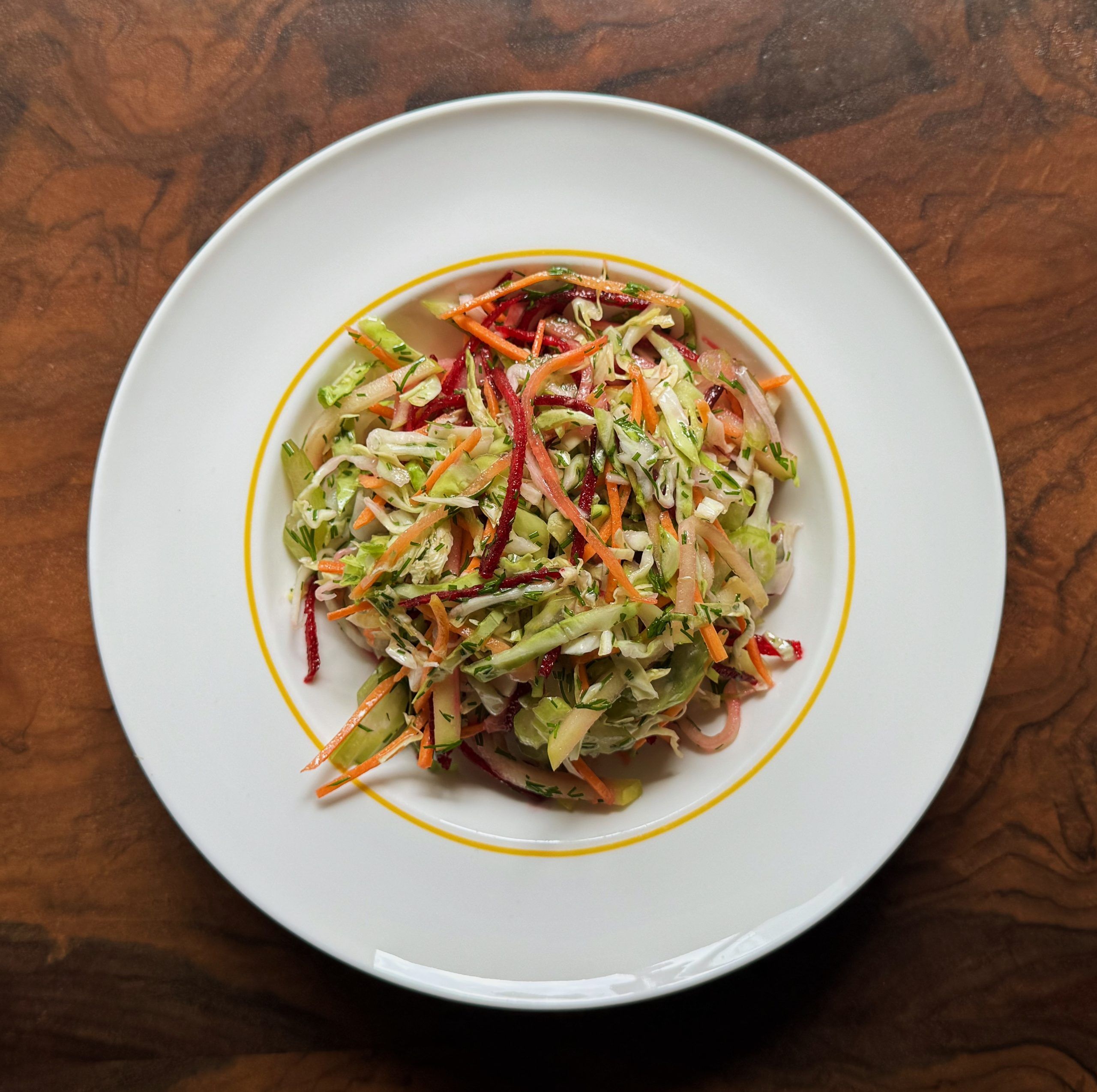 Коул слоу/ Молода капуста/ Яблуко/ Морква/ Стебло селери/ Фенхель/ Цитрусовий дресінг/ Кріп